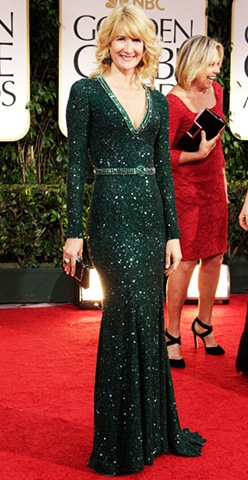 From the runway to the red carpet, Hollywood’s latest fashion trend is sleeved dresses. Best Actress winner, Michelle Williams, was an image of romantic elegance in a navy velvet embroidered gown by Jason Wu. Best Actress winner, Laura Dern, sparkled in an emerald Andrew Gn gown with a plunging neckline and belted waist.