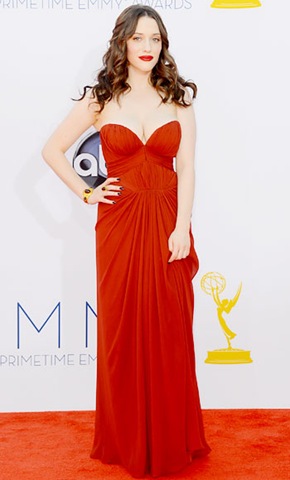 2 Broke Girls star, Kat Dennings, was ravishing in a wine hued goddess gown by J. Mendel. Her fair skin, raven hair and matching lips were the perfect complements to this beautiful look.