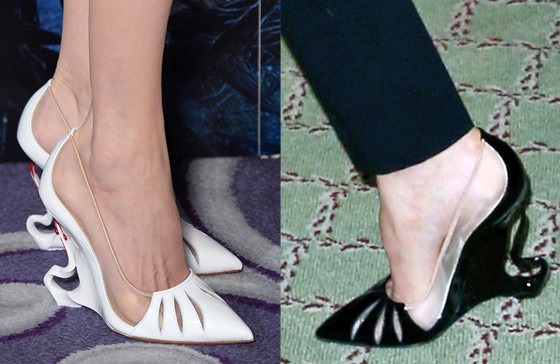 From London and Paris to Shanghai, Maleficent star Angelina Jolie has been channeling her latest character in fashionably creative ways. Wearing sophisticated but sexy dresses and pants, Jolie has completed her ensembles with killer shoes from Christian Louboutin. The stunning custom heels are meant to resemble Maleficent’s famous horns, and the white version even had blood dripping down the back.