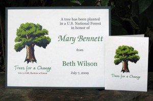 Trees for a Change is an organization that plants trees as gifts in U.S. National Forests that have been destroyed by wildfire.  With the Personalized Tree Gift, a tree will be planted by the U.S. Forest Service in an area that is desperate for reforestation.  Mom will receive a personalized tree planting certificate, a gift card with your personal message, her name recorded on the Tree Gift Registry, and online access to photos and information where the tree was planted.