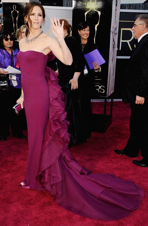 Jennifer Garner was breathtaking in a custom gown by Gucci.  The deep plum hue was a beautiful pop of color, while her vintage Neil Lane necklace and cascading ruffles added a bit of drama to this elegant ensemble.